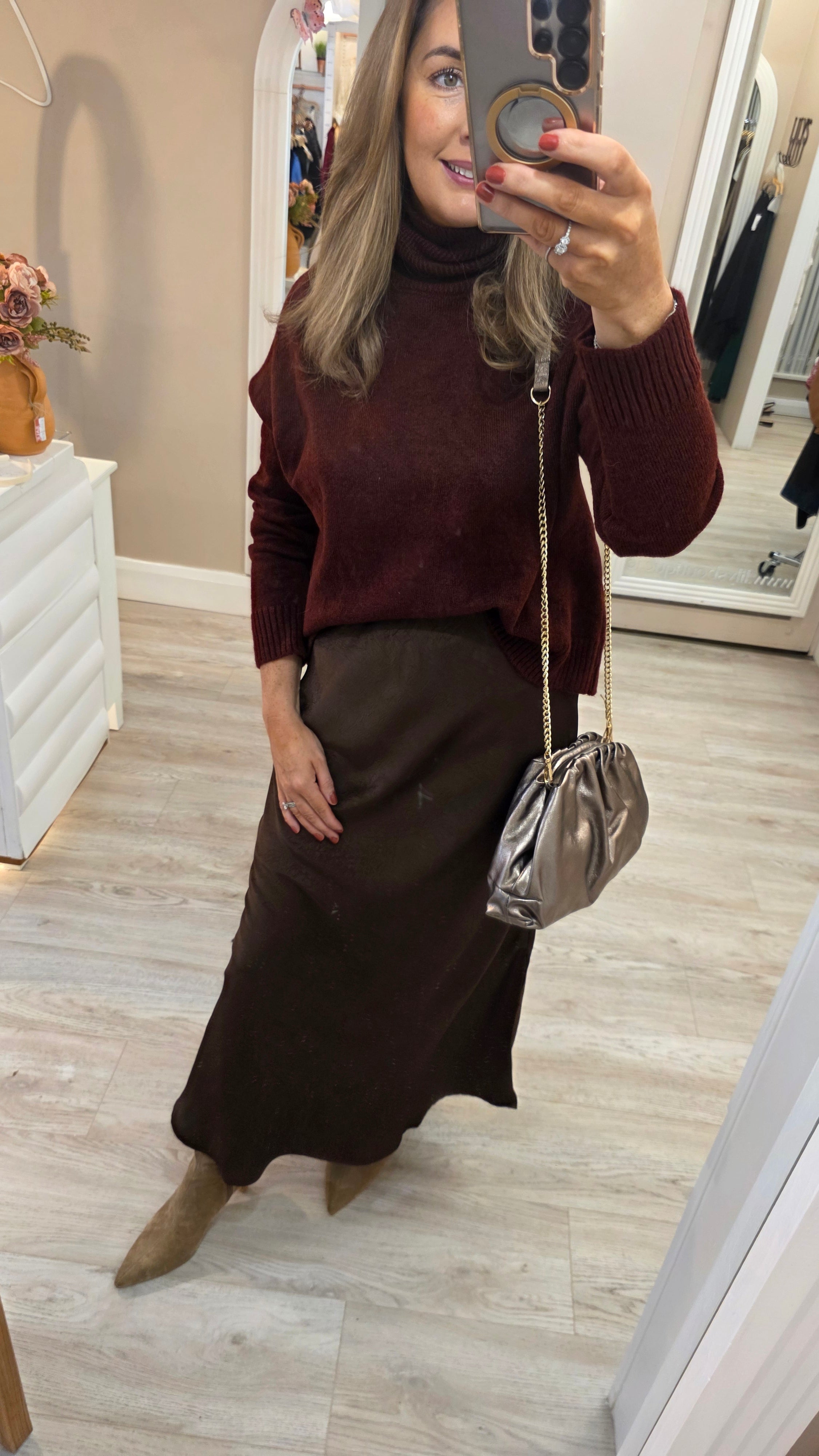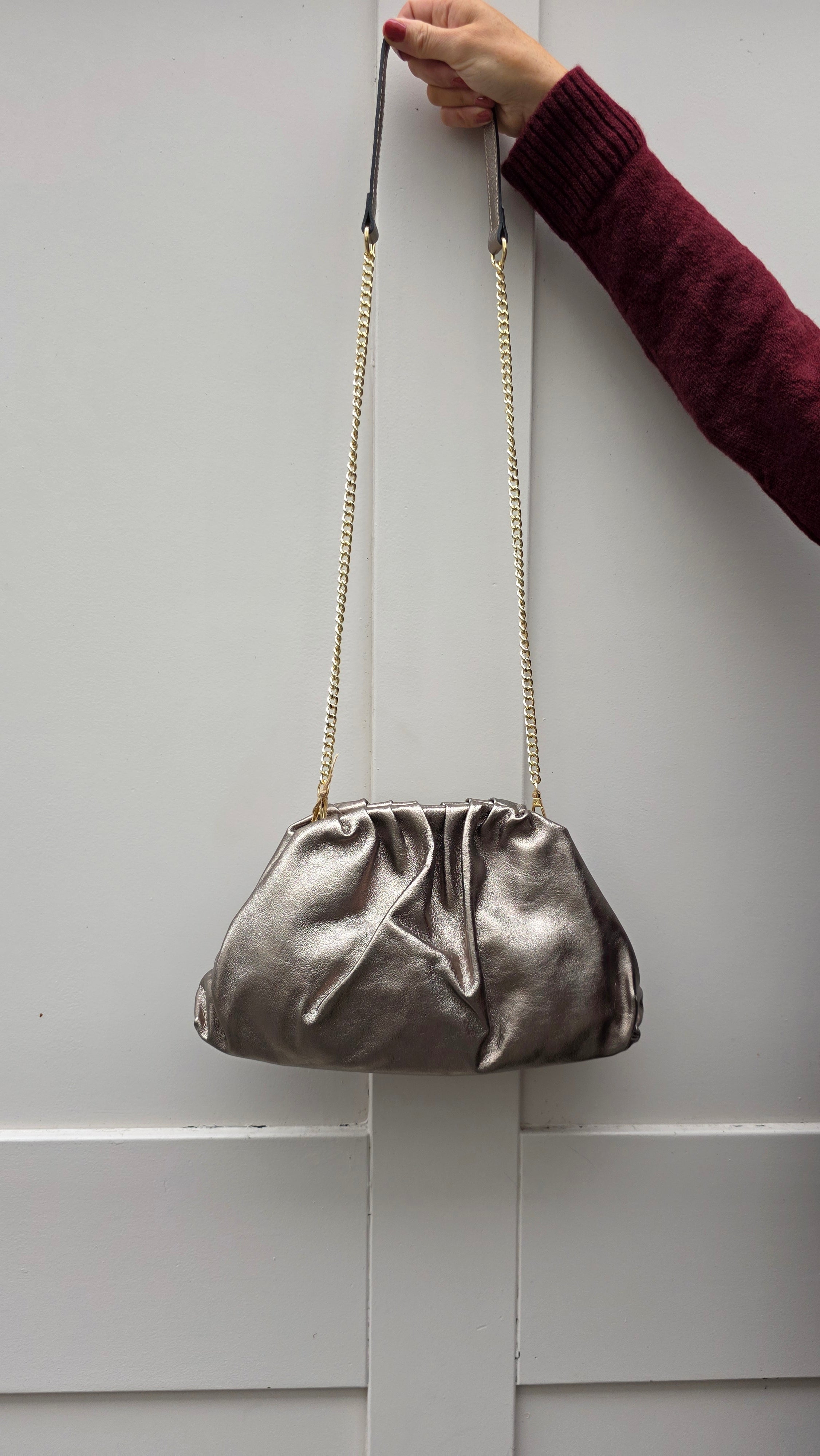 Add a touch of glamour to your evening look with this luxurious ruched metallic clutch bag, crafted from 100% genuine leather. The soft, pleated design creates a cloud-like silhouette with a beautiful, luminous finish that catches the light. A delicate gold-tone chain strap and matching hardware offer a sophisticated feel, allowing you to wear it over your shoulder or carry it as a clutch. It's the perfect accessory to complete a sophisticated outfit for a night out or a special occasion.