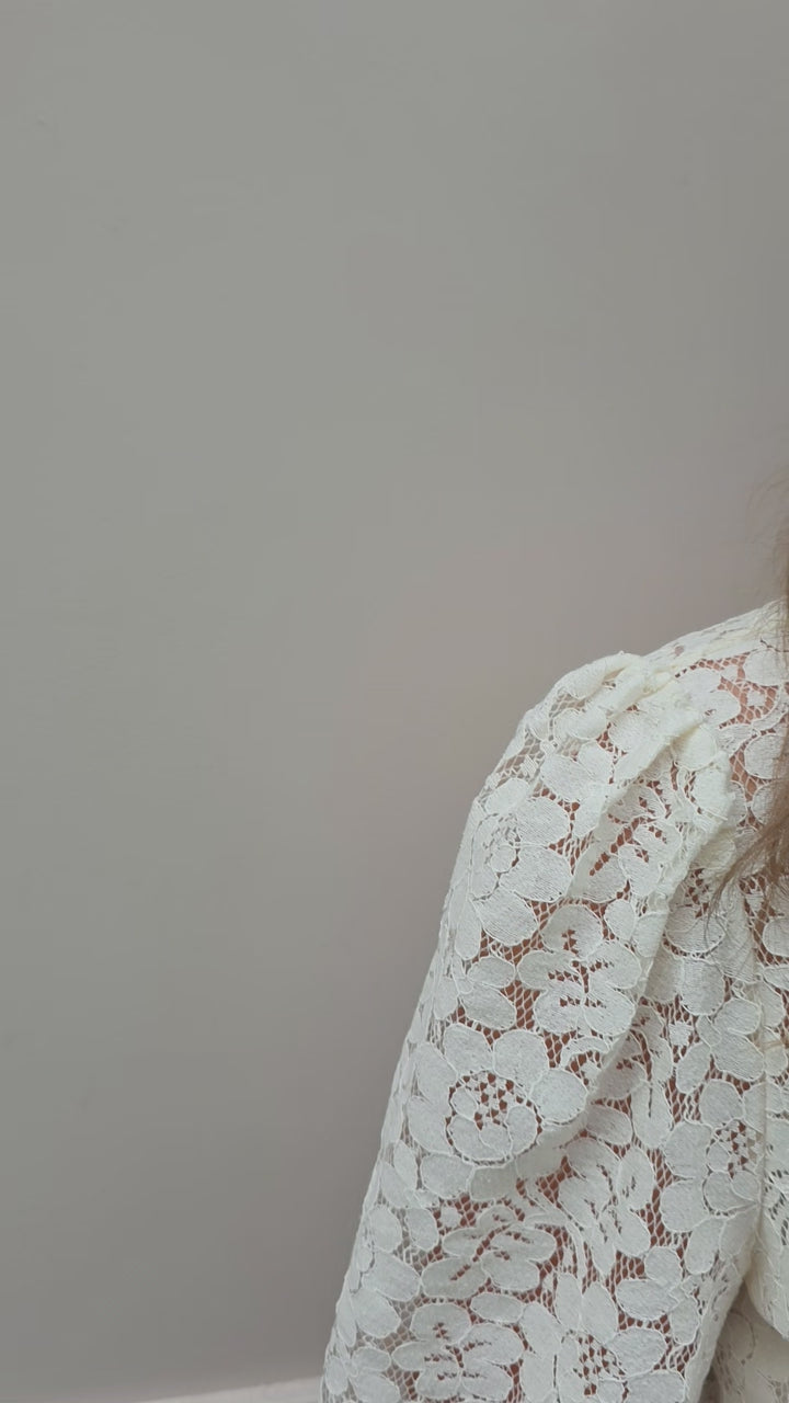 Embrace vintage romance and high-fashion elegance with the Parisian Lace Blouse. This striking piece is crafted from delicate, textural floral lace in a beautiful off-white/ivory colour. It features a sharp collar, elegant bishop sleeves with fitted cuffs, and a detachable, voluminous satin pussy-bow tie. The fitted silhouette and sheer sleeves create a sophisticated contrast that pairs perfectly with tailored trousers for a dramatic evening or workwear look.