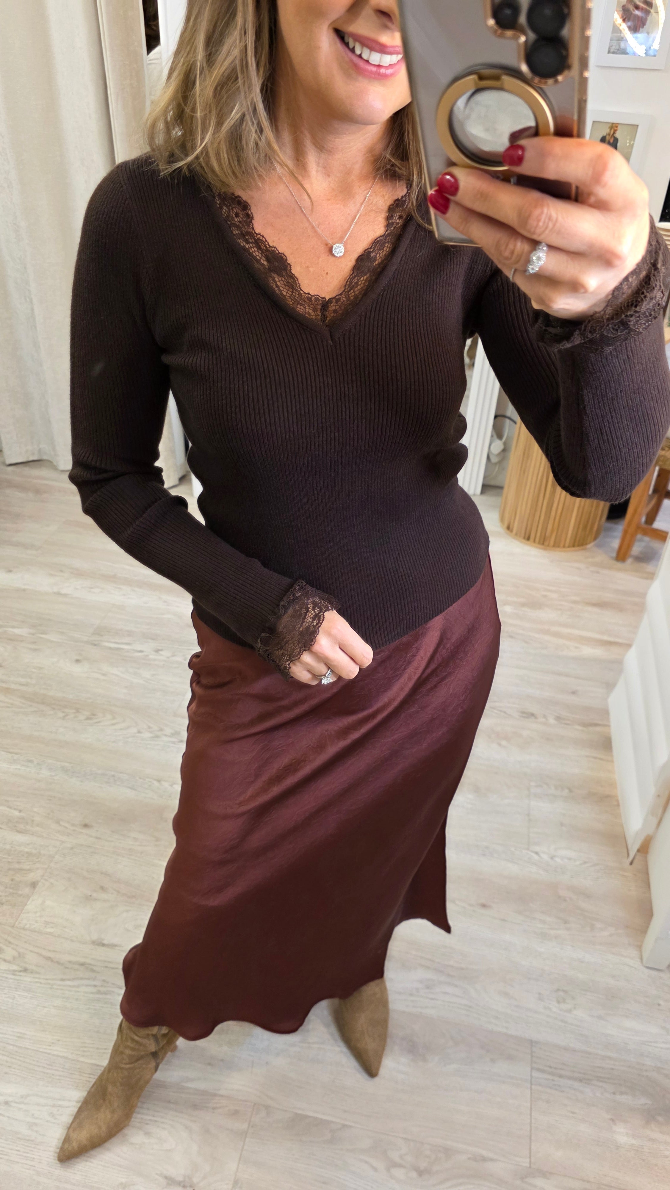 The Espresso Lace-Trim Knit Elevate your essentials with this rich chocolate ribbed top. Crafted for a flattering, slim fit, it features a delicate lace-trimmed V-neckline that adds a touch of romantic femininity to a classic silhouette. Soft, stretchy, and perfect for tucking into high-waisted trousers or leather pants.