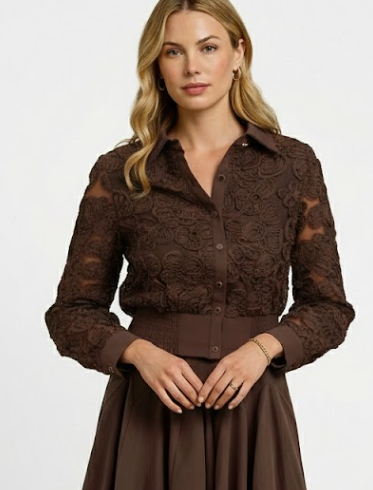 The Espresso 3D Rosette Blouse Dark romance meets modern texture. This stunning chocolate brown shirt features intricate, three-dimensional ribbon-style embroidery on a semi-sheer base. The look is grounded by a solid collar, button placket, and cuffs, while the wide, shirred elastic waistband creates a flattering, cinched silhouette that accentuates the waist.