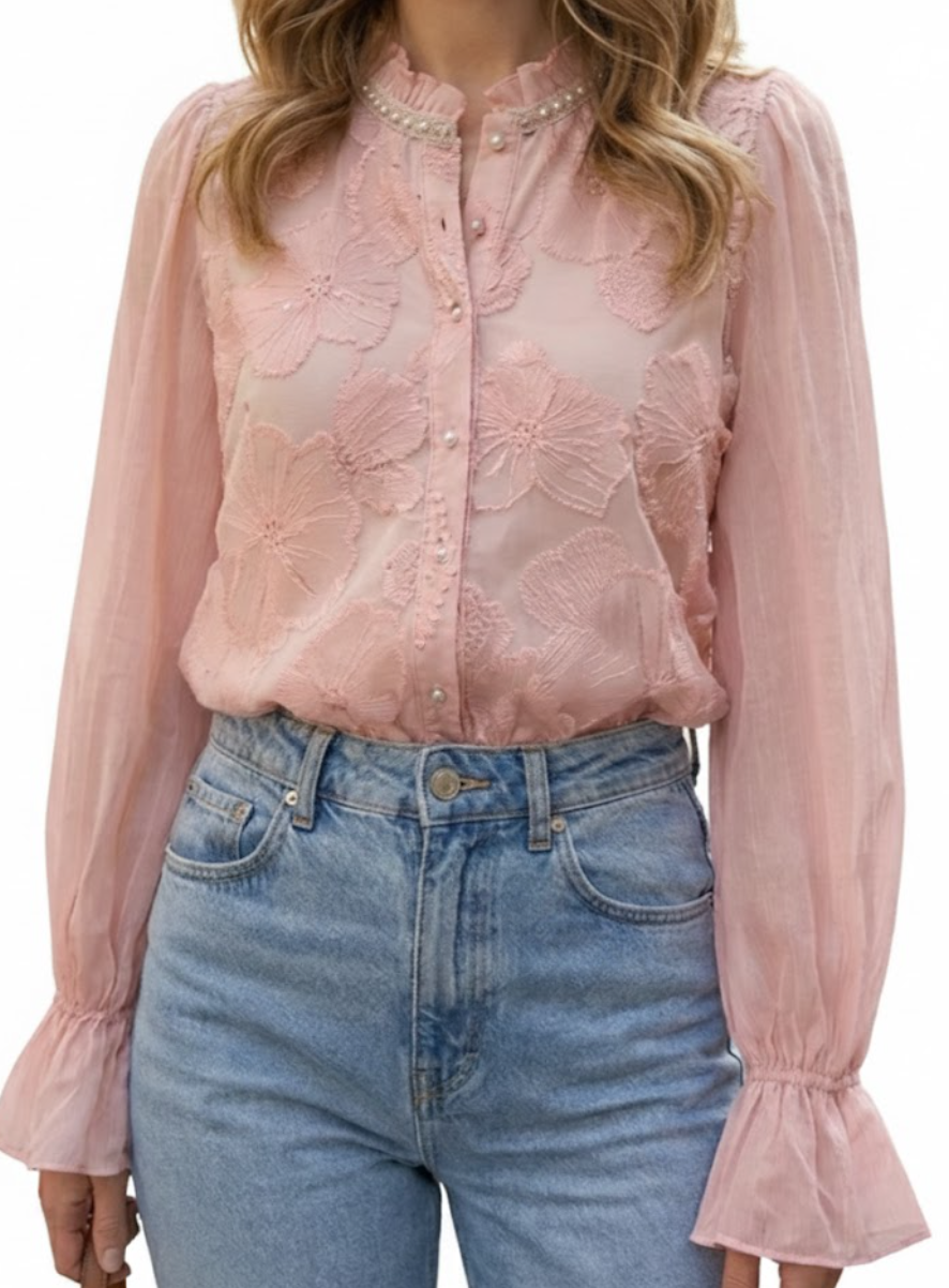 Infuse your look with romantic, vintage-inspired charm with this exquisite button-front blouse. Cut from a smooth, luxurious fabric in a delicate blush pink, this piece is instantly elevated by its striking detailing. It features a beautifully oversized, rounded Peter Pan collar and intricate white lacework meticulously placed across the yoke and sleeves. The pearl-effect buttons and scalloped collar edge add a final touch of polished femininity, making this blouse a sophisticated statement piece perfect for special occasions or effortlessly chic everyday wear.