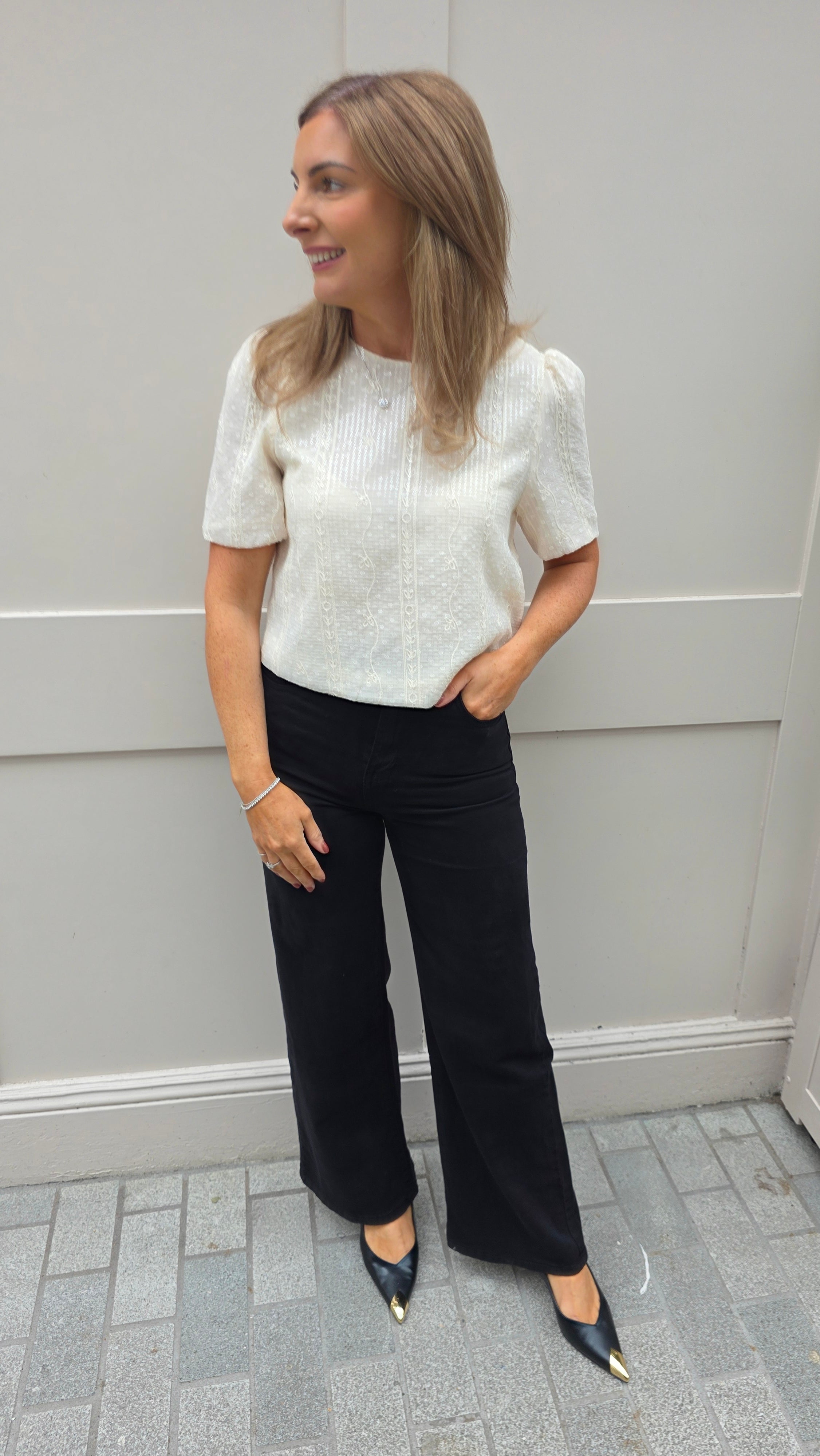 Elevate your casual look with the subtle shimmer of the Whisper Sequin Tee. This elegant top is crafted in a beautiful off-white/cream fabric featuring delicate, tonal sequin and embroidered detailing in vertical stripes. The crew neck and short, softly puffed sleeves keep the silhouette classic and wearable, while the gentle sparkle ensures you stand out. Pair it with dark trousers for evening cocktails or tuck it into high-waisted denim for a sophisticated daytime look.
