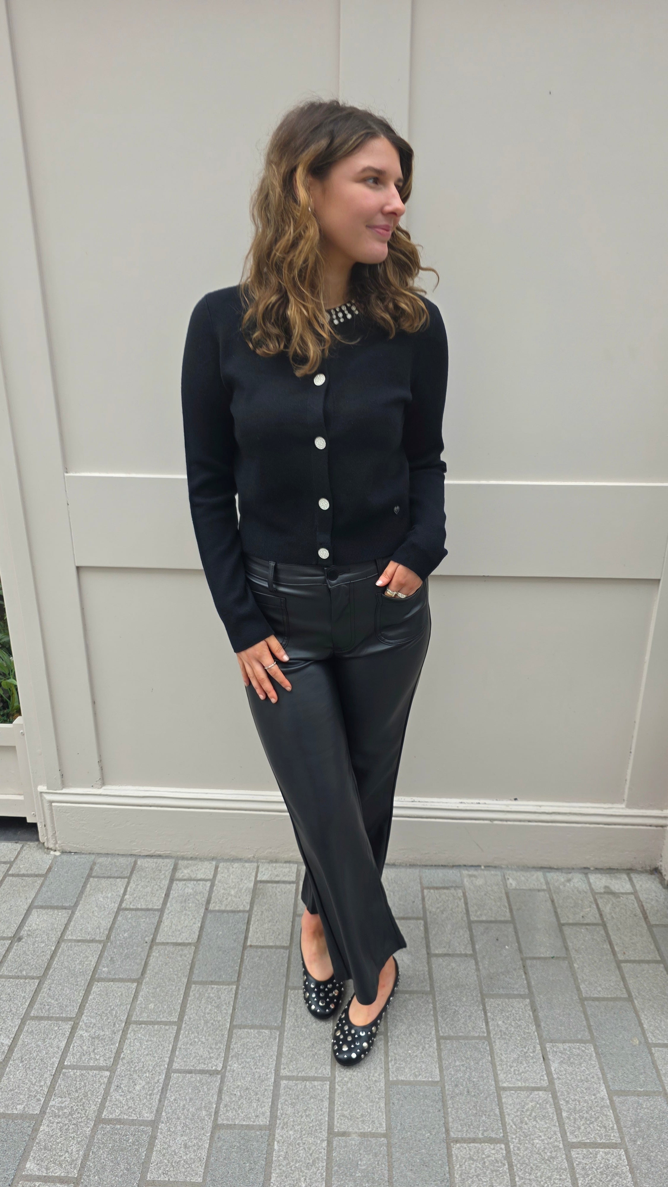 This is a black cardigan with a round neckline. The front features a button-down closure with large, silver-toned buttons embellished with a shiny center, resembling a rhinestone. The neckline is also decorated with a band of clear, sparkly rhinestones. The cardigan has a small heart-shaped embellishment with a rhinestone in the center on the left side near the hem. The fabric appears to be a knit material.