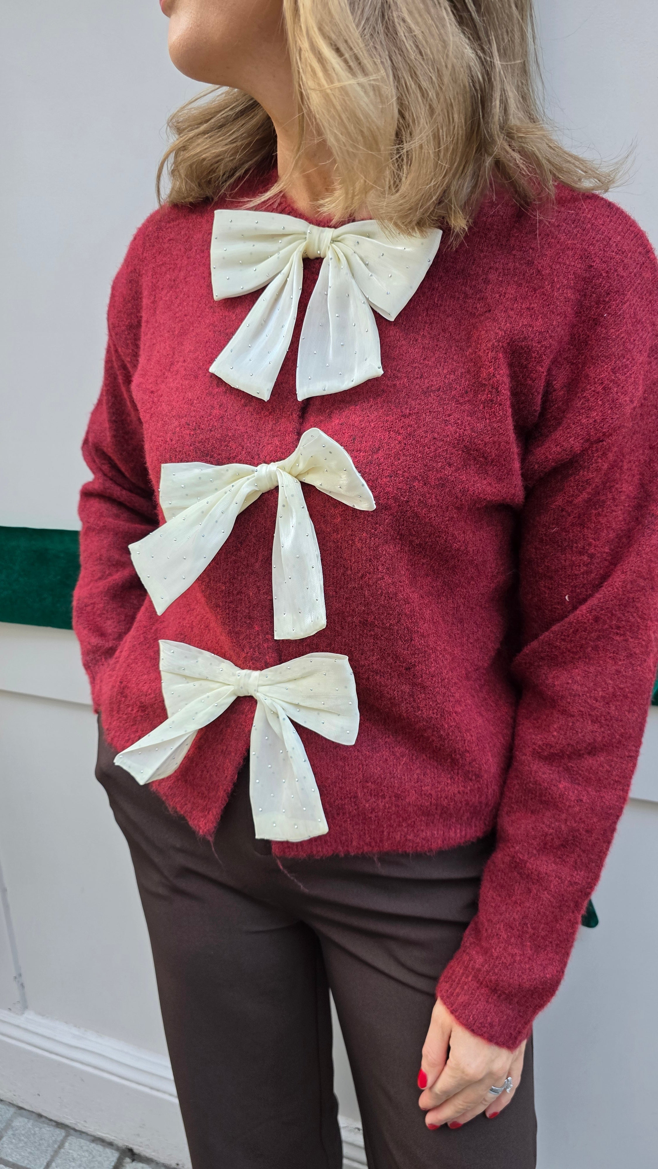 A cozy crewneck sweater in a deep cherry red knit. This statement piece is embellished with three oversized, textured ivory bows down the front, each featuring subtle polka dot detailing. Perfect for adding a whimsical, festive touch to your casual denim or styling for holiday events.