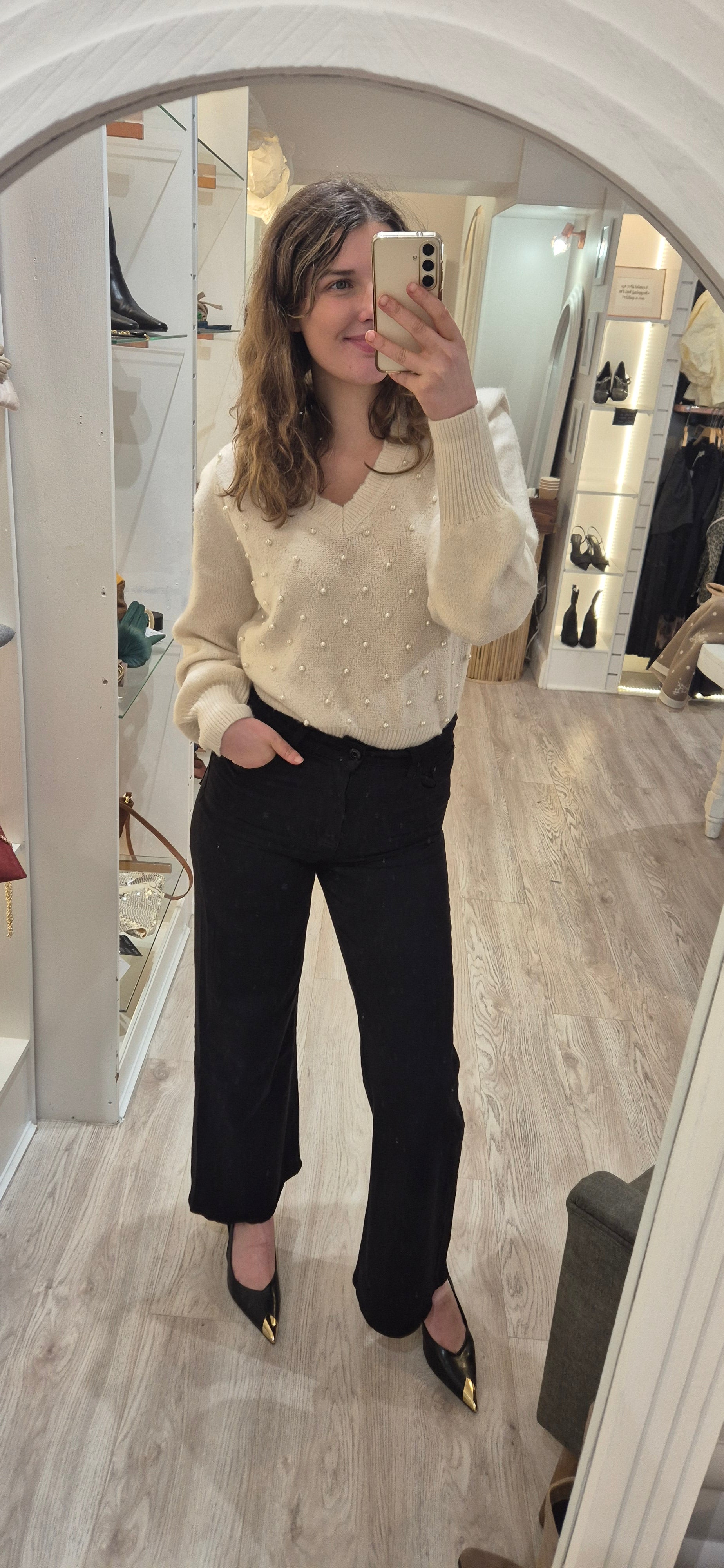 Embellishment: The entire front of the sweater is adorned with randomly scattered small faux pearls, adding a delicate, glamorous, and textured finish.