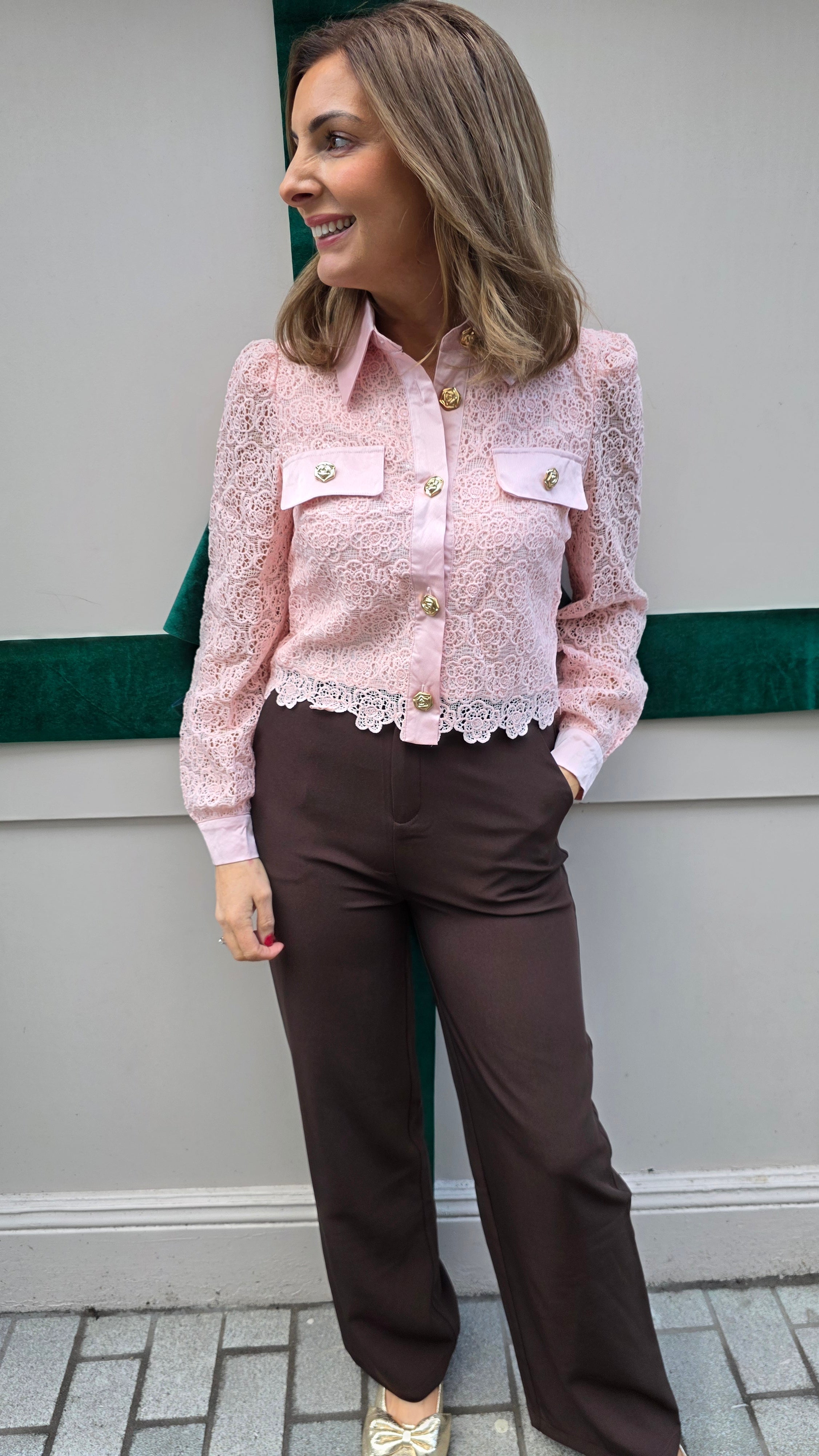 This top is a perfect blend of delicate texture and structured tailoring, offering a unique take on the classic shirt silhouette. It's an excellent choice for a sophisticated evening or cocktail look.