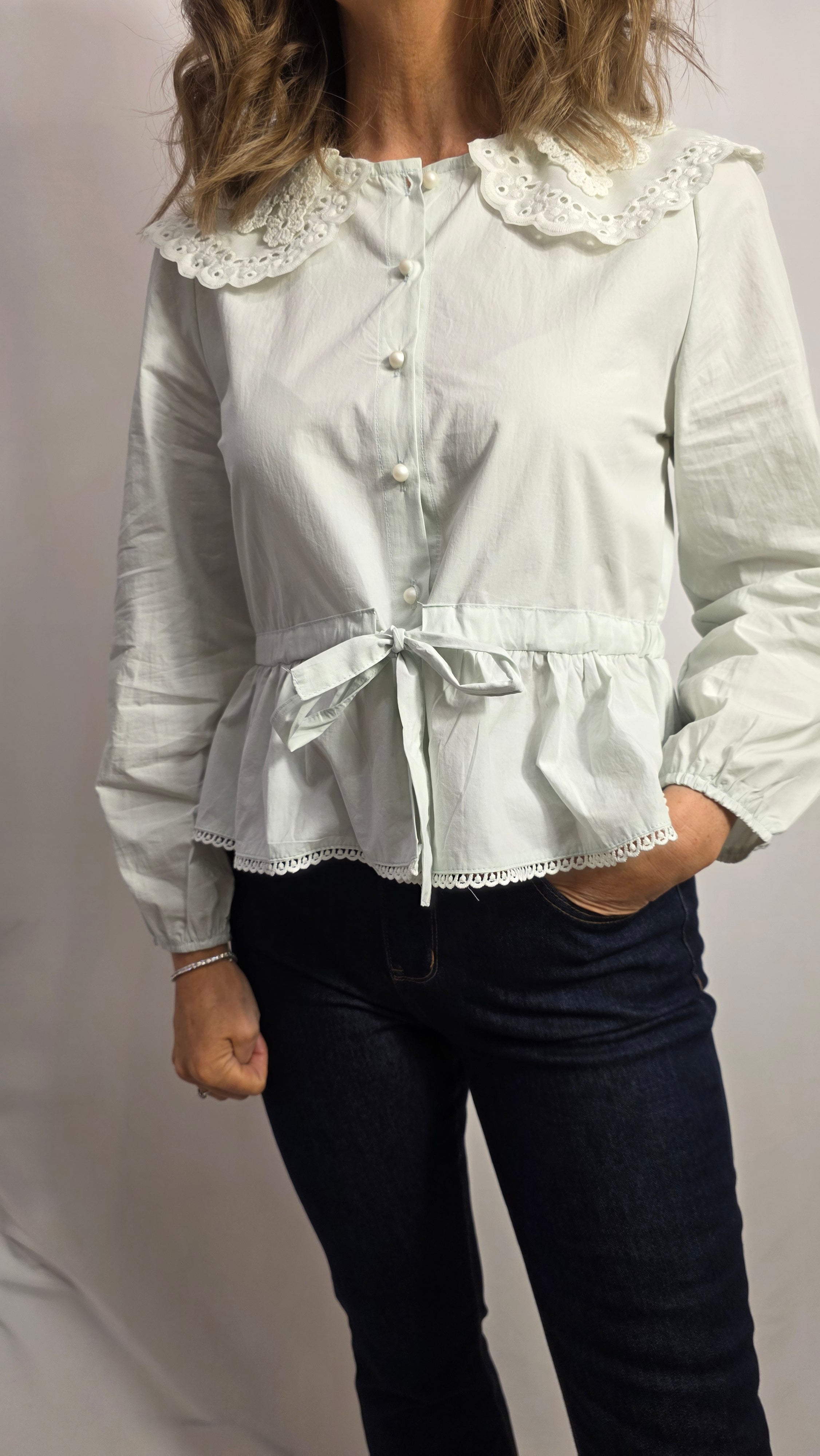 ​Add a romantic touch to your wardrobe with this delicate pastel mint blouse. Defined by its oversized vintage-inspired collar and feminine silhouette, it’s a timeless piece for any occasion.
