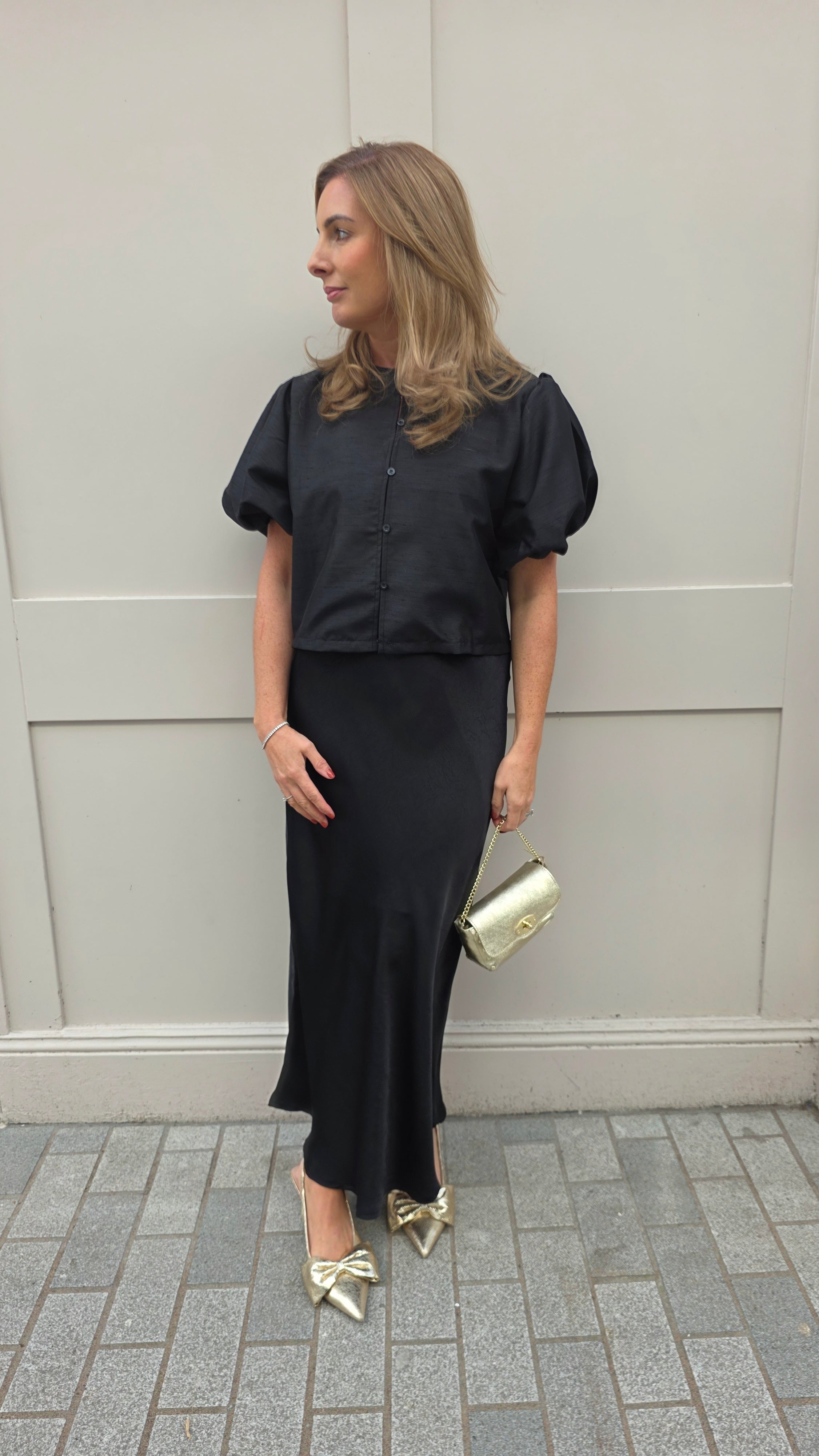 This is a black short-sleeve blouse with a full button-down front. It has a round neckline and small, matching black buttons. The most notable feature is the voluminous, puffed sleeves that gather at the shoulders and the cuffs. The fabric appears to have a subtle sheen and a textured, shantung-like finish.