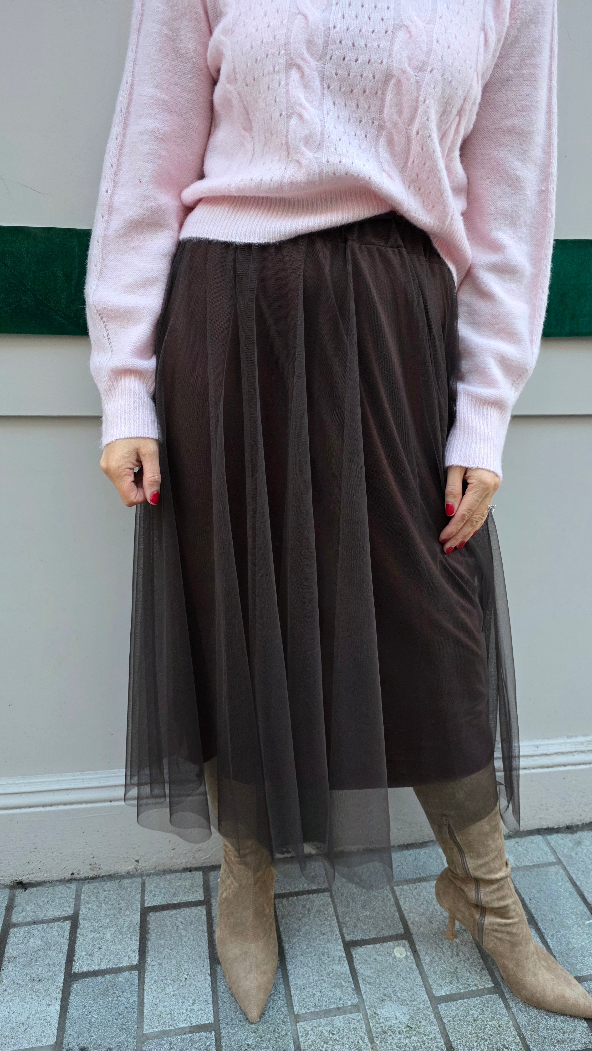 Dark Tulle Maxi Skirt Ballerina chic meets everyday elegance. This sweeping skirt features layers of soft tulle for maximum volume and romance. Easy to style—just add a chunky cream sweater and boots for a fashion-forward look.