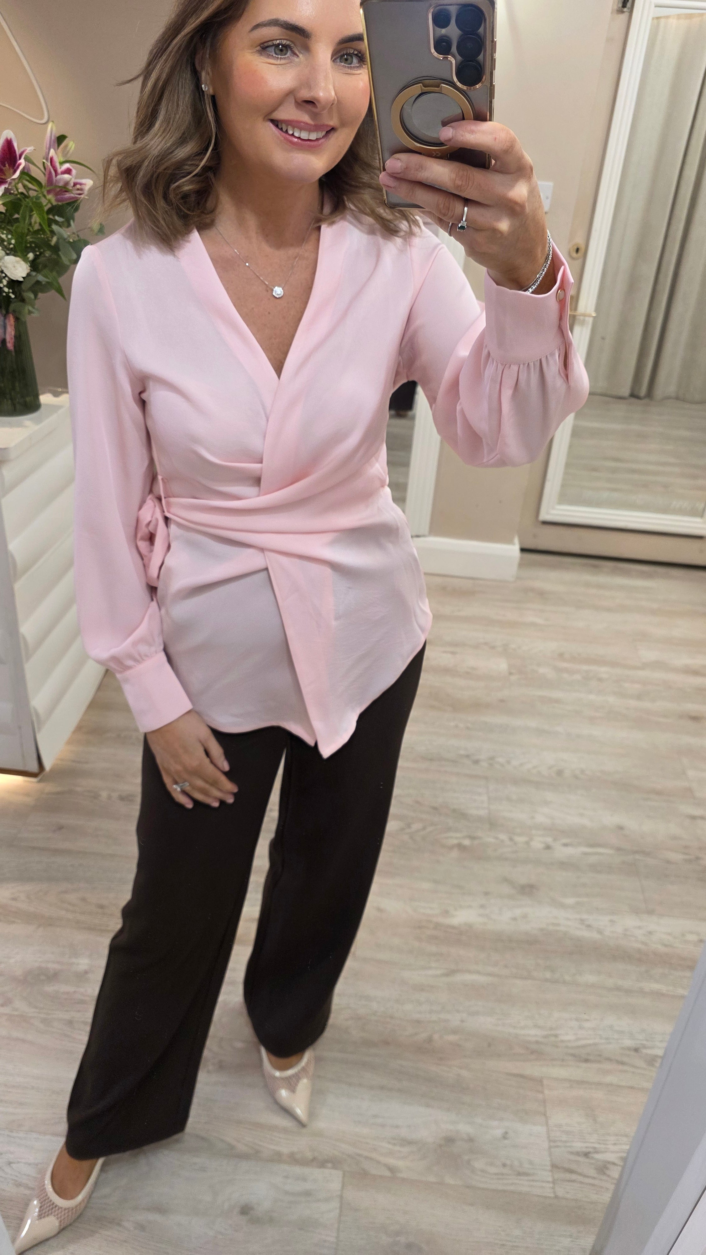 This Pink Wrap Blouse is the epitome of feminine elegance, designed to provide a flattering and customizable fit for any occasion. Its soft, blush-pink hue and smooth satin finish make it a versatile staple for both professional and evening wardrobes.
