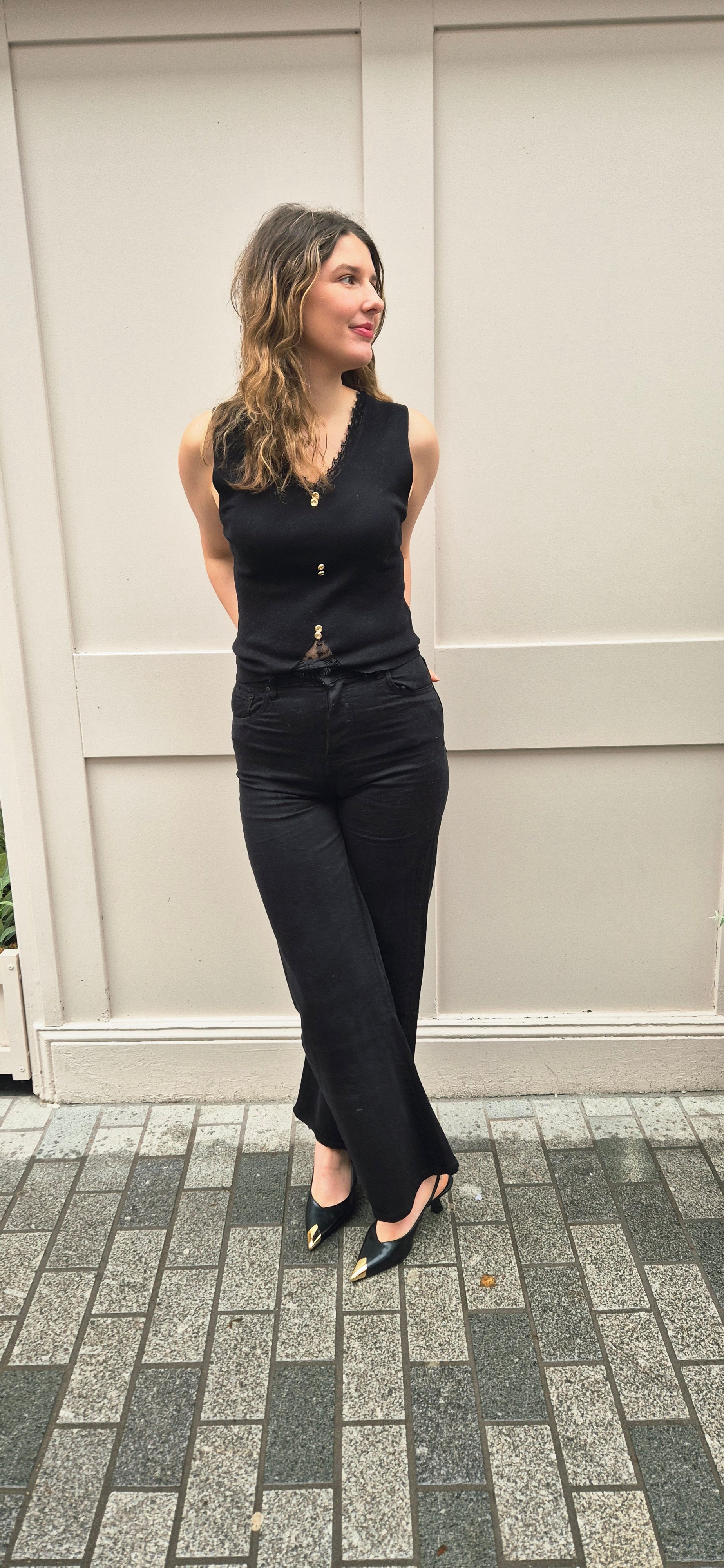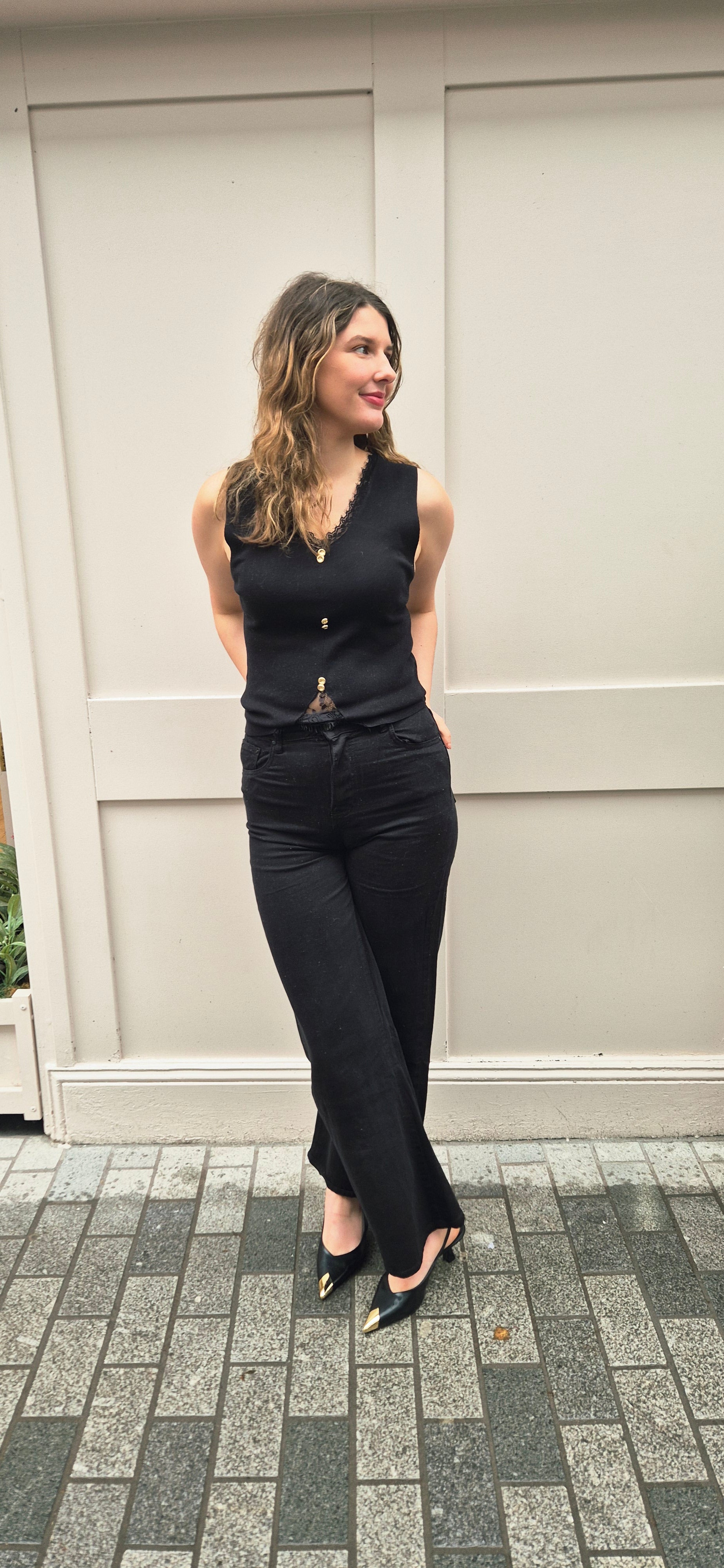 This piece is a delicate and versatile layering essential, featuring a blend of smooth fabric and feminine lace detail.