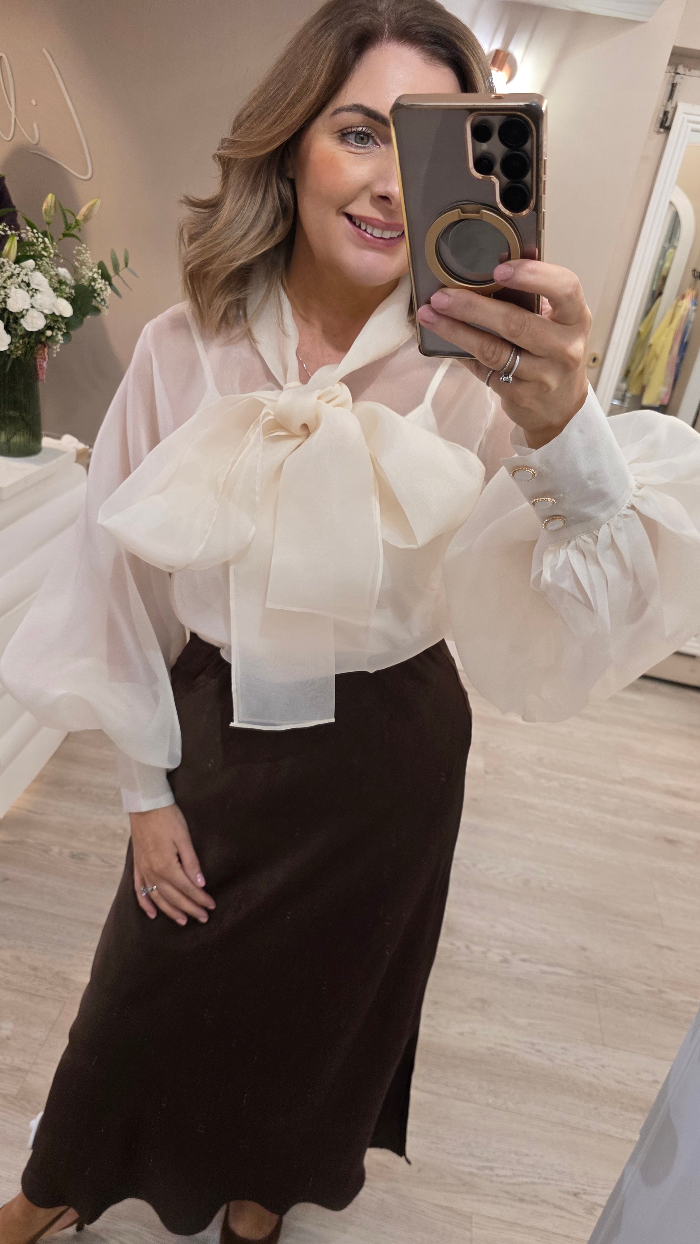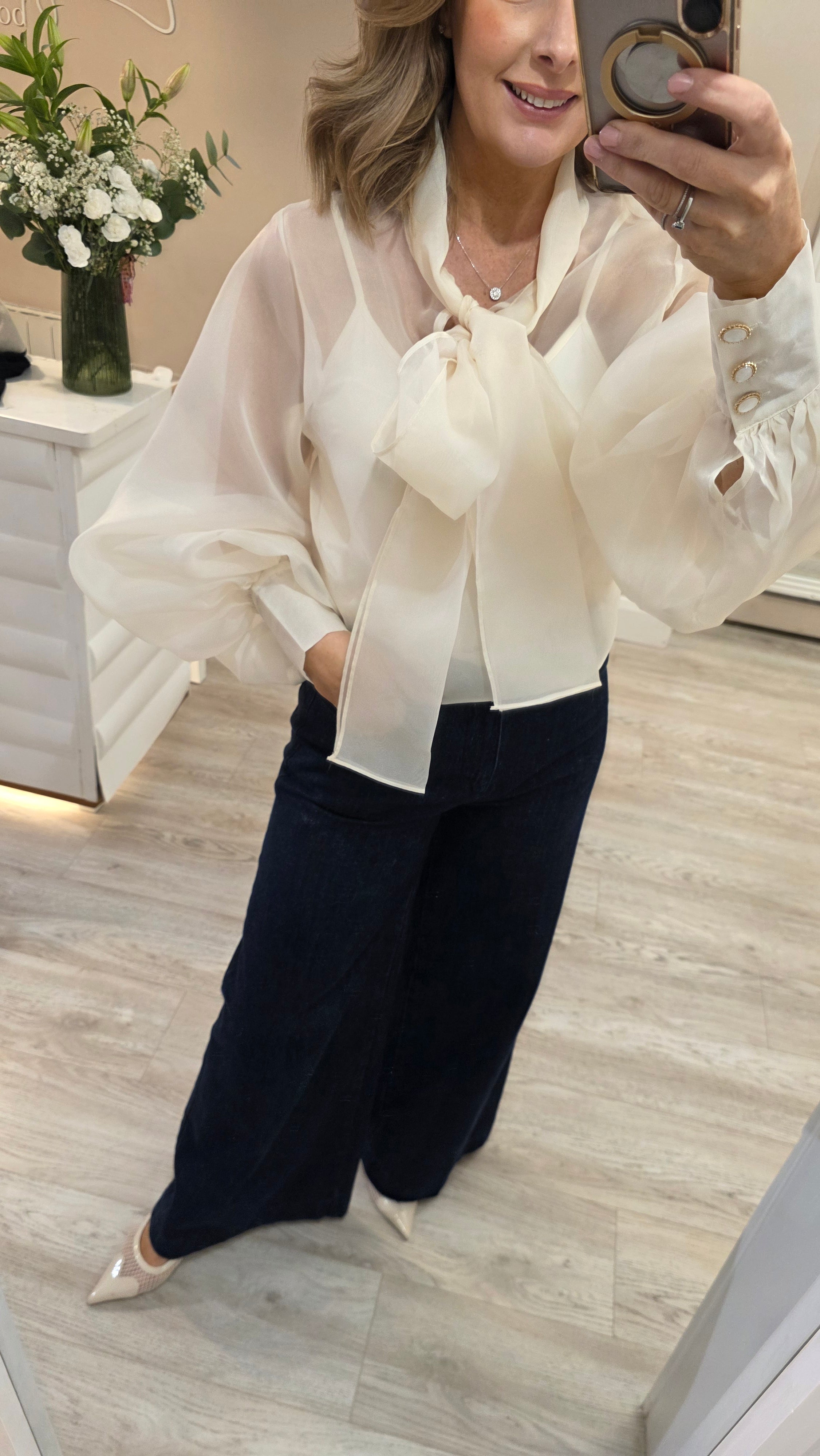 Sleeve Detail: It features bishop sleeves—dramatic, billowy volume that gathers at a tall, structured button cuff.