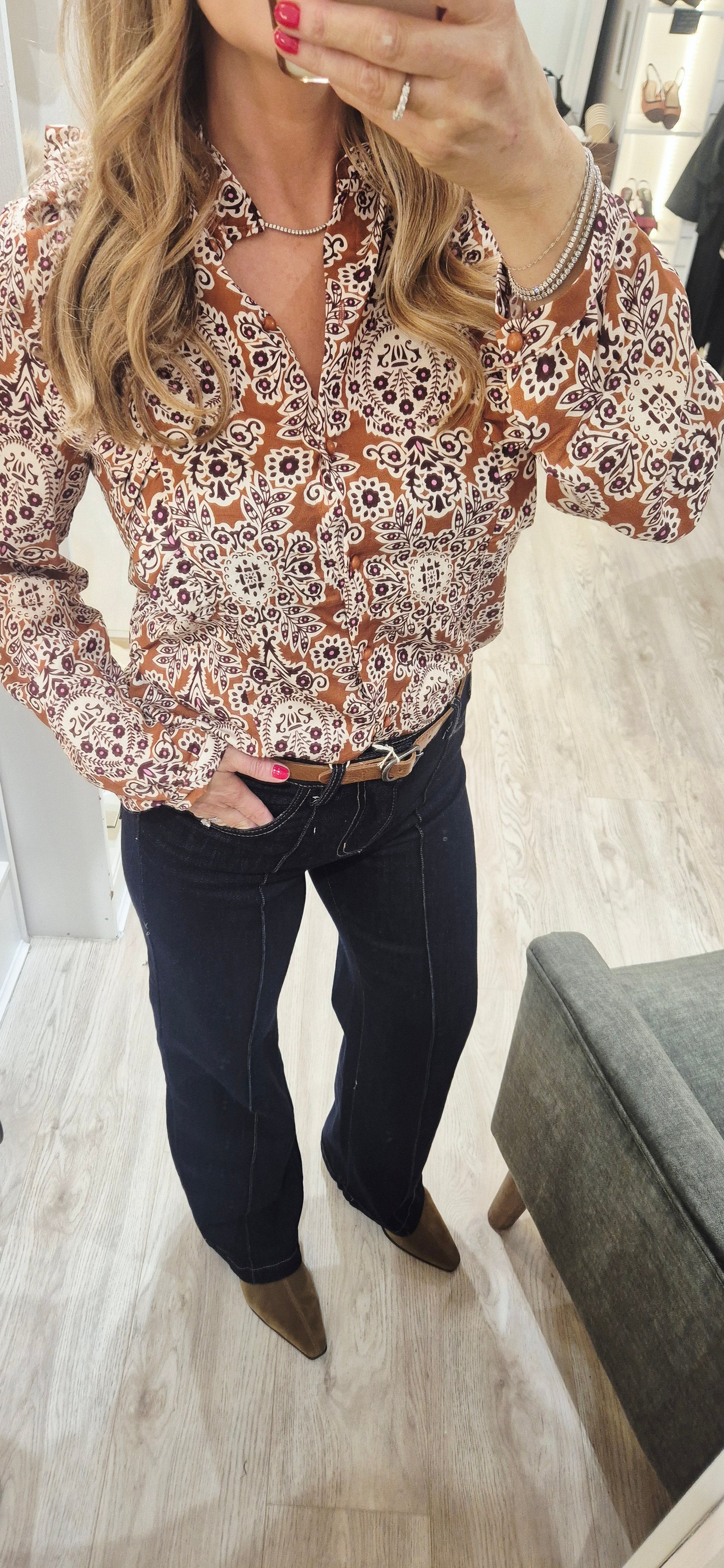 Tuck this blouse into high-waisted brown or black trousers (as pictured) for a polished, autumnal look, or pair it with tailored skirts for the office. The rich colors make it easy to transition from a daytime meeting to an evening event.