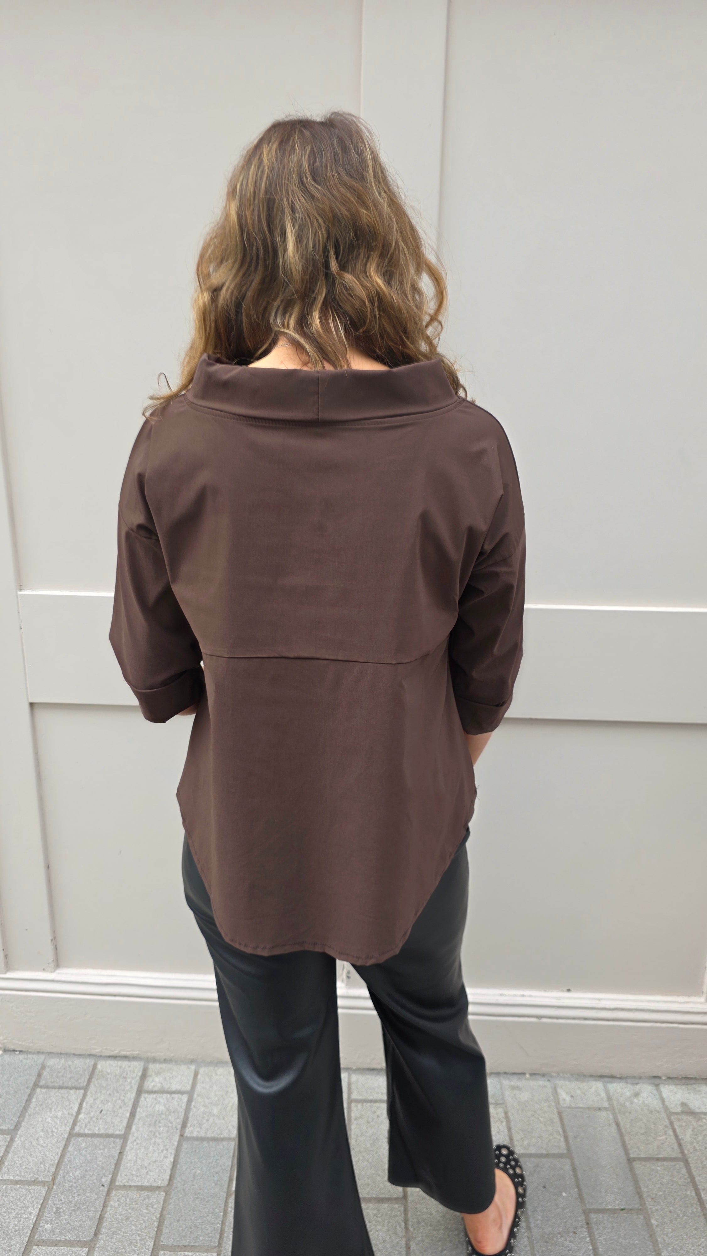 This is a Brown, long-sleeved top with a cowl-like high neck. The top has a loose, poncho-like fit and features a high-low hem, where the front is shorter than the back. The sleeves are wide with a three-quarter length and have a folded cuff detail. The fabric appears to be a thick knit or jersey material.