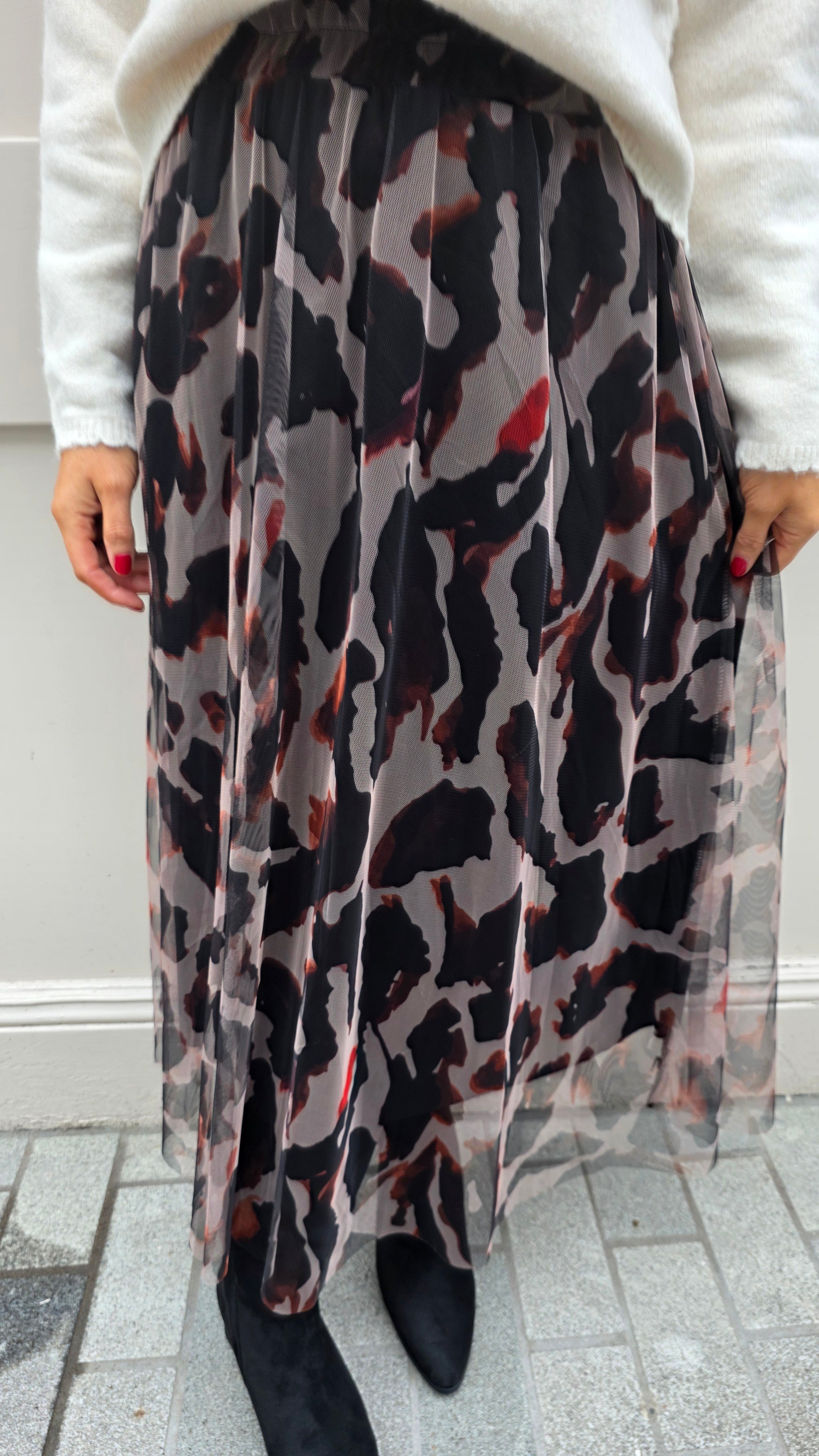 Silhouette: The skirt has a maxi or midi length (it falls below the knee), with a full, flowing silhouette created by the gathering of the sheer fabric.