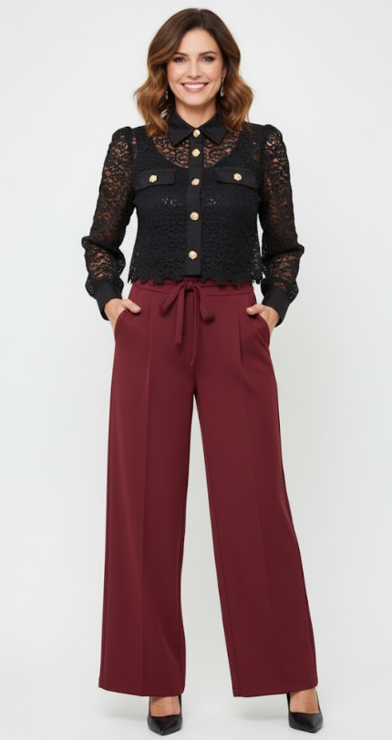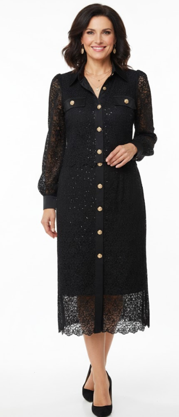 Fabric: Intricate Floral Lace overlay on the body and sheer lace sleeves, providing depth and texture.