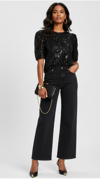 A striking, cropped evening top featuring a rich black lace base with an overlay of scattered black and silver sequins. Designed with a sophisticated crew neck and chic cap sleeves, this piece adds instant festive glamour to any outfit. Perfect for pairing with high-waisted trousers or dressing up a classic skirt.