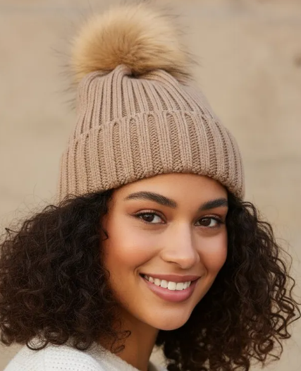 Stay stylish and cozy this winter with our Pom Pom  Taupe Hat. The soft fleece lining ensures maximum comfort, while the elegant ribbed design adds a touch of sophistication. With a standard adult size and adjustable fit, it's perfect for every occasion. The large pom pom adds a playful touch and can be fluffed for optimal volume. Don't sacrifice style for warmth – this hat has both!
