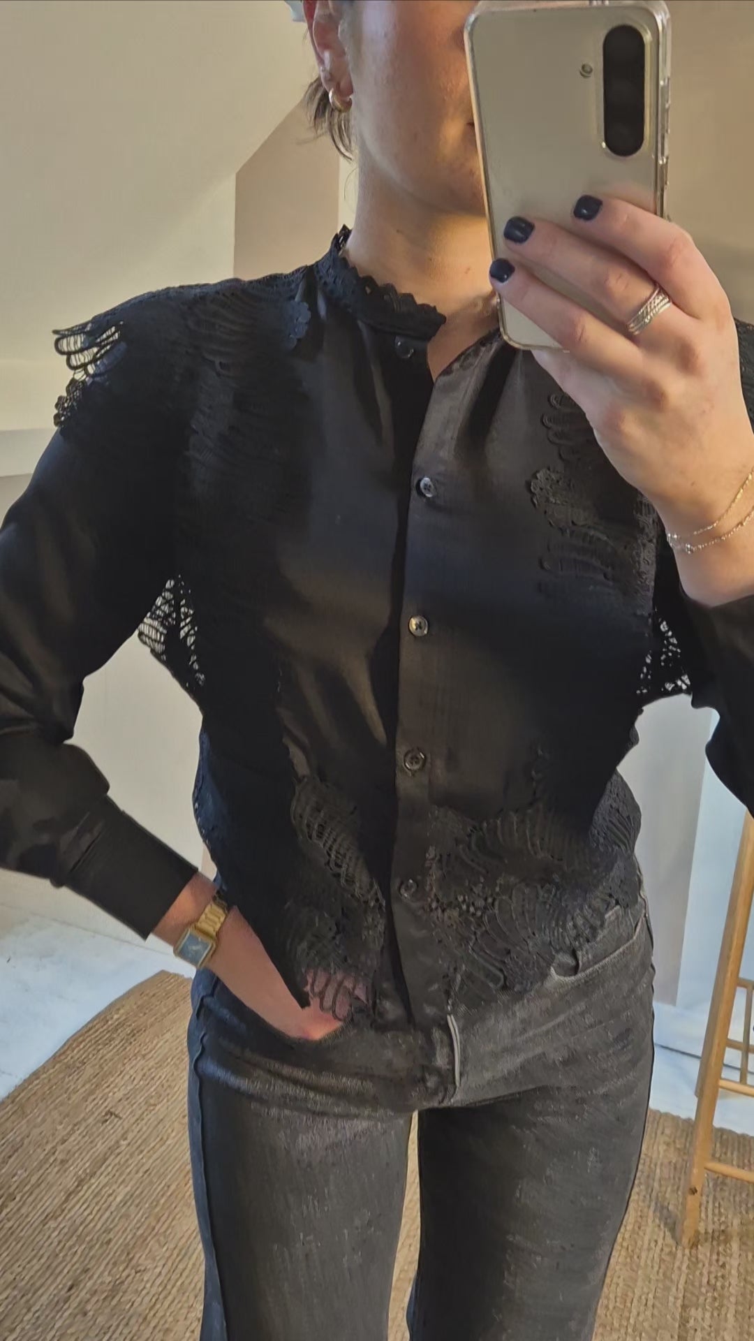 Check out this beautiful blouse with stunning lace detailing on the sleeves and down the front. It's absolutely gorgeous!